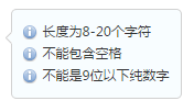 在密码下方有一行说明文字“8-20位,不能有空格,纯数字的话要9位以上”,是密码的输入规则说明,用的是大系统的通行证密码规则,大系统的规则是这么说明的: