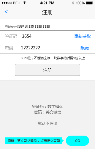 密码用英文默认键盘[+23],键盘多了一个设定,右下角的按钮,用“GO”,表示且执行“提交”,问过研发的同学,尽管是英文键盘,依然可以显示成中文“前往”的,但考虑到是英文键盘,“前往”可能会让人觉得这是中文键盘,还是GO吧[+24]。