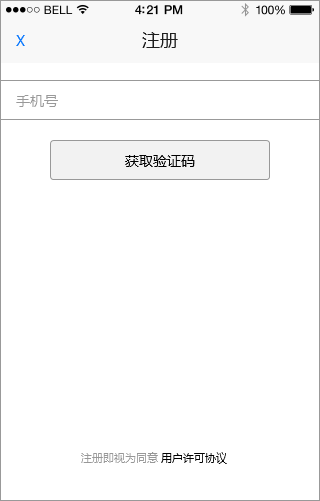导航栏左侧按钮用X,代表对注册任务的取消[+7],代表这个界面跟上一个界面没有层级关系,当然个人认为这不是很重要,就算是放一个返回按钮,用户也完全能够理解的。输入框采用左边固定标签,输入域在右边的设计,
