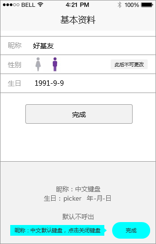 性别单击选择,这里有一个运营规则,性别以后不能再改了。于是在选择后有这么一个动态提示“此后不可更改”出现在右侧。为什么默认不显示,默认显示界面复杂度多一分,且可能没人看[+37]。单击后以动态的方式出现,从无到有且带动作,用户的眼神就能被吸引过去[+38]。