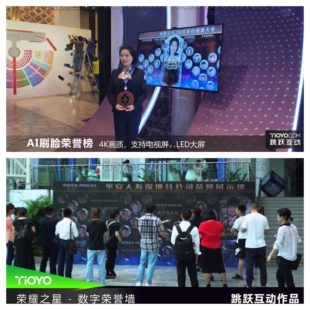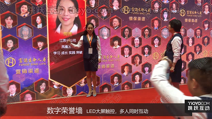 引用先进的科技,为企业活动提供创新、高科技的互动体验,彰显企业创新精神和科技实力。产品过硬的触控算法和自主研发的人脸识别技术,来宾不需要任何操作,系统自动识别,荣誉内容实时呈现。