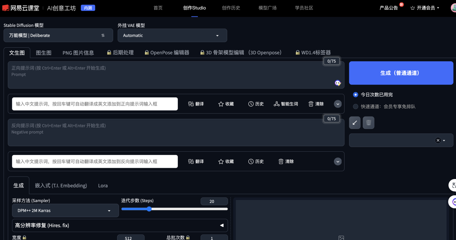 笔者这里跳过了繁琐的本地部署安装,使用了网易云端SD(内测阶段目前每天有10次免费出图次数,进阶用法需付费开通使用)。