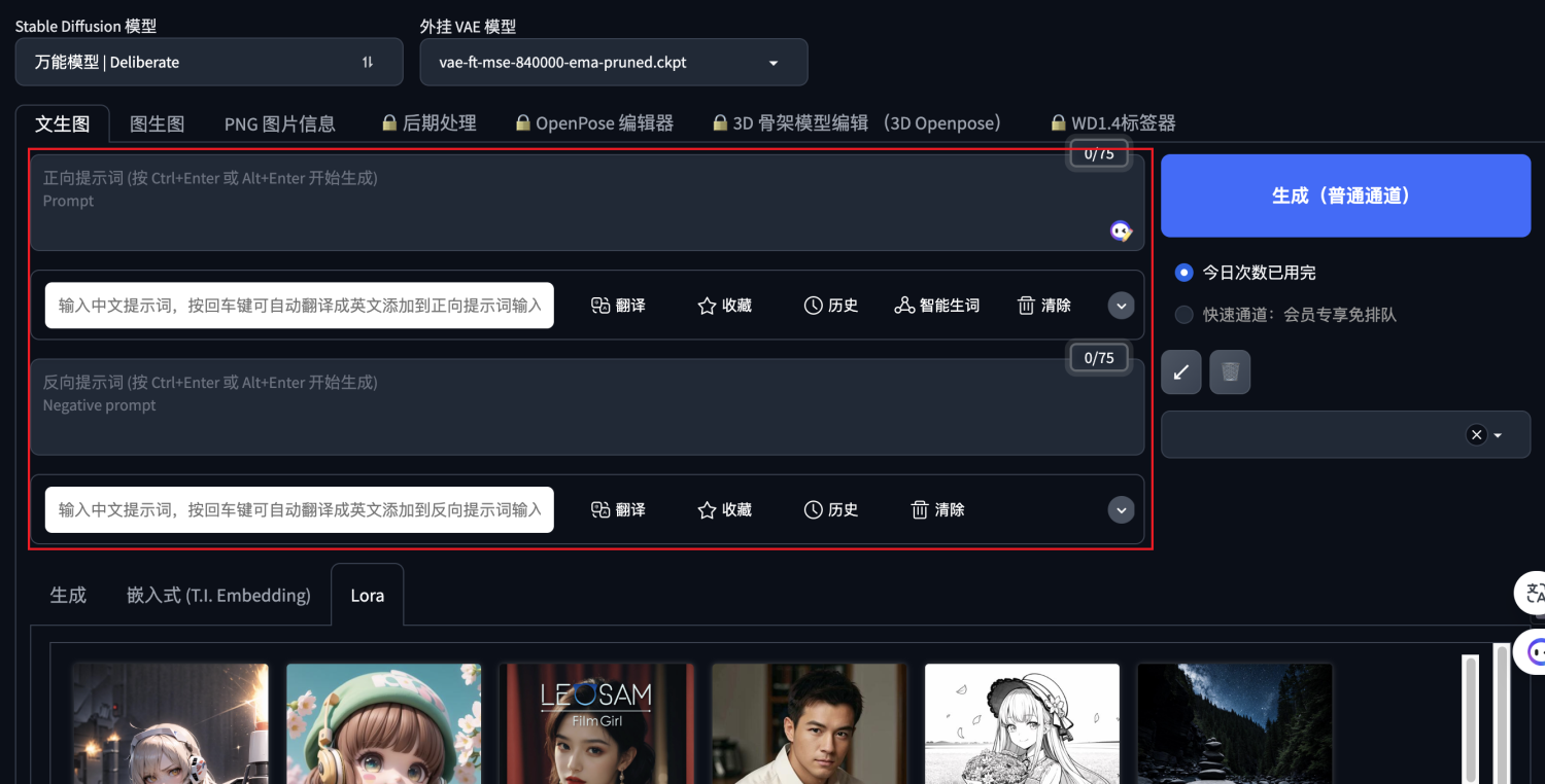 注册登录以后,点击顶部的“创作studio”,即可打开云端SD界面。对比过主界面,基本上1:1还原了本地SD的功能,甚至自带prompt汉语翻译,操作可以无缝对接。