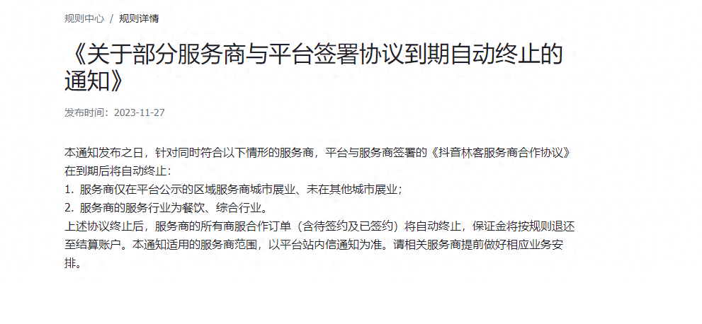 离2024年只有半个月的时间了,本应是本地生活服务商收获果子的大好年头。然而抖音在11月27日一文公告震惊了整个本地生活服务行业。本地生活服务商如梦惊醒。该公告明确说明除了区域服务商清退所有全国服务商,本地生活全国服务商将成为历史不复存在。这一举动被视为本地生活行业的一刀切。