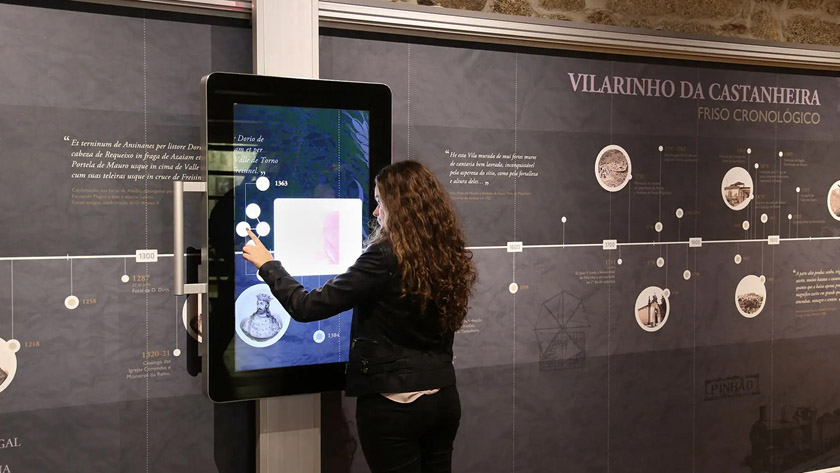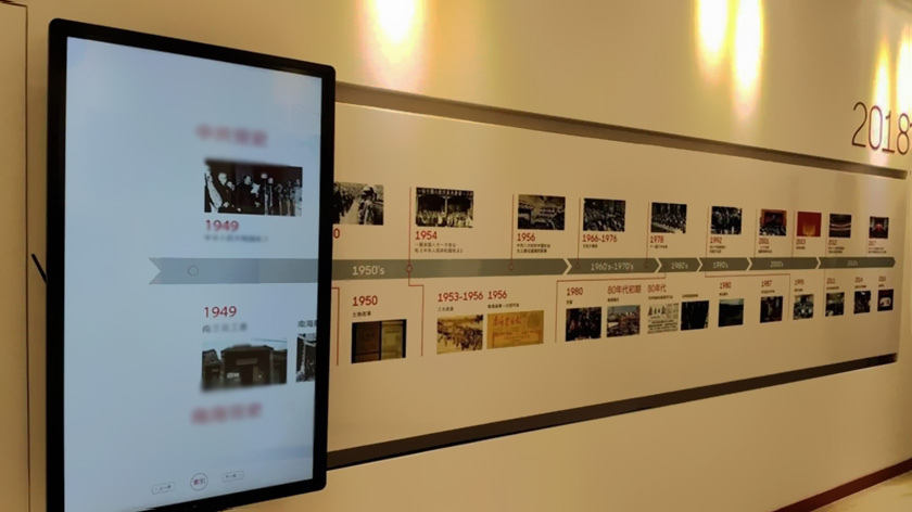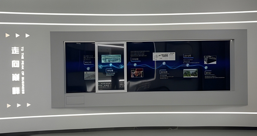 直线滑动的移动滑轨屏在多媒体展厅中最为常见,也因为这种展示特色,其被用于事件发展或生产流程等具备时间线的内容展示,正是如此,它的出现取代了大多数的静态墙面展板设计,它的安装也相对简单,前期需确定背景墙具体尺寸,根据此确定轨道长度及合适的滑轨屏,再对每个需停留的点位设置感应装置,即可实现用户对滑轨互动系统的操作控制,每当滑轨屏到达感应点位时,便会停留并详细讲解对应信息。