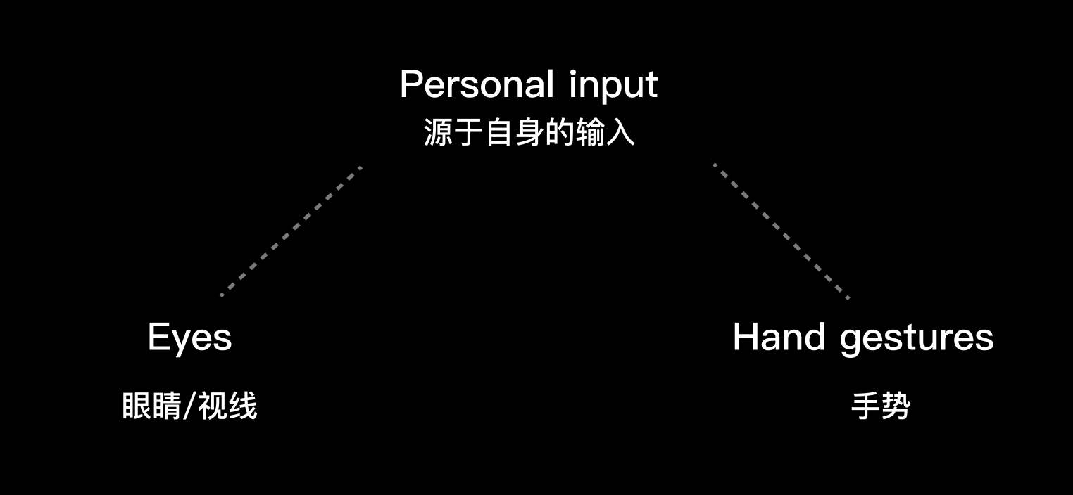 "Personal Input 个人输入"是一种源自用户自身的交互方式,与主流的XR设备的“手柄交互”有所不同。这是一种更接近“直觉”的交互方式。通过结合视线和手势,用户只需将手放在膝盖上,就可以利用环绕在设备周围的12个摄像头与机器进行交互。这种交互方式引出了“视线输入”和”手势输入“方式。