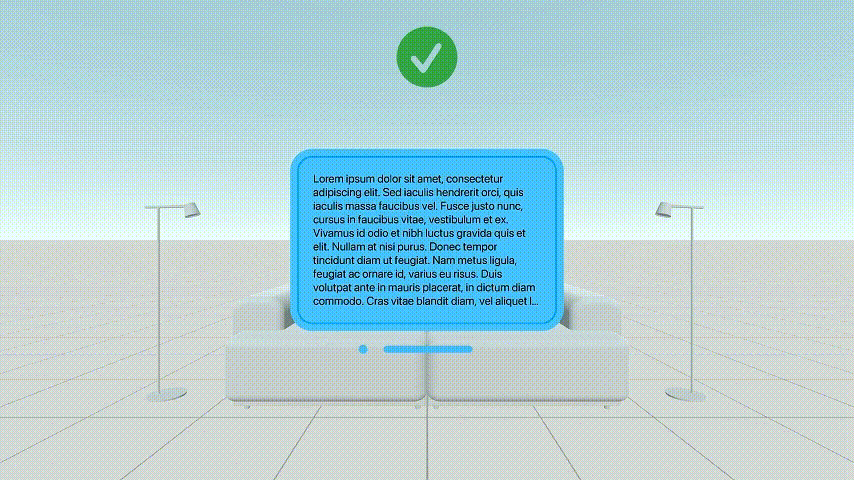 需要长时间聚焦的内容,如阅读,应支持用户调整深度。数据表明,将内容放在超过手臂长度的距离更适合长时间查看。我们应避免将内容放置在过近的距离,以减轻视觉负担。除非使用场景更适合采用直接触碰的交互模式。同时,我们应关注用户的环境与应用的对比度,如从暗环境到明亮环境的过渡,应给眼睛足够的适应时间(大家都有睡觉时被突然开灯的经历吧)。