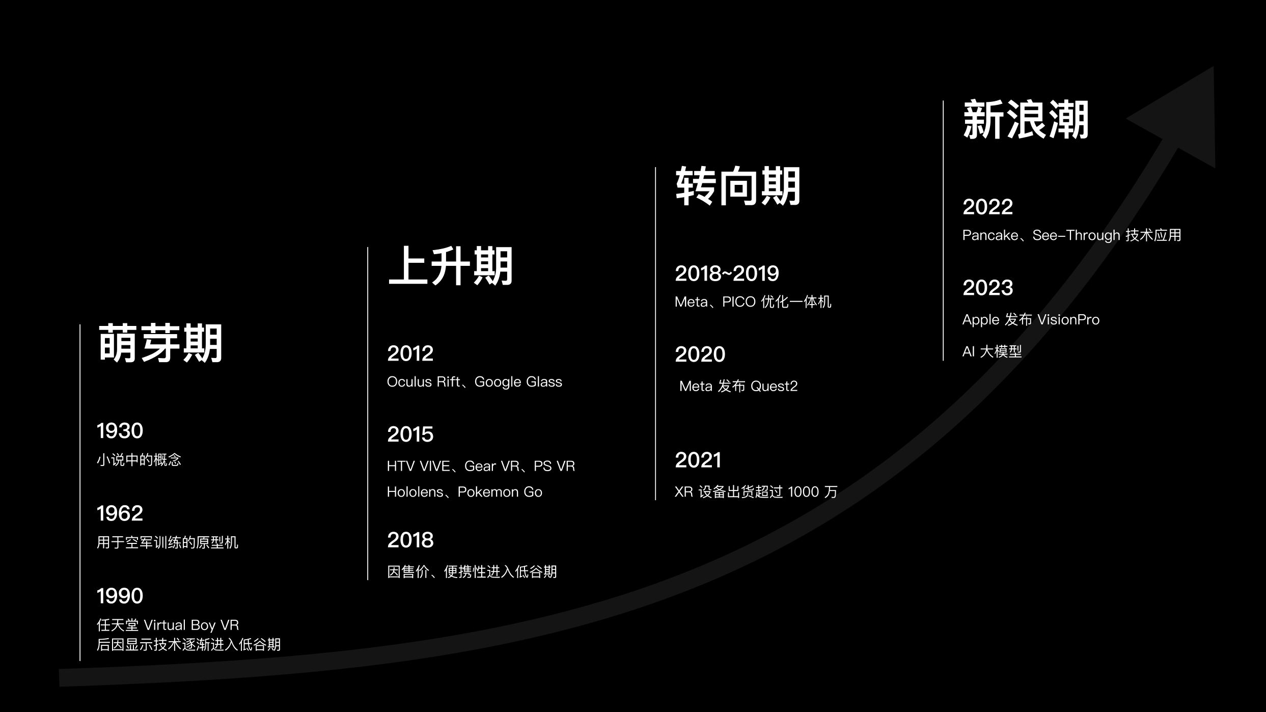 XR行业的发展历程可以被概括为四个主要阶段:萌芽期、上升期、转向期以及新浪潮。