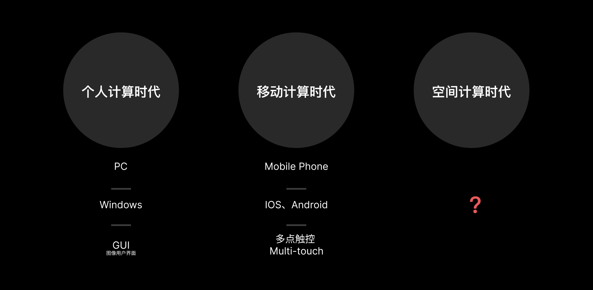 我之所以认为XR可能成为下一代的内容平台,是因为我在回顾个人计算时代和移动计算时代的过程中,发现人与机器交互速度的提升是一个重要的标志。从个人计算时代的GUI(用户图形界面)到移动计算时代的Multi-touch(多点触控),我们可以看到,无论技术如何更新换代,其核心始终是关注人与机器的交互效率和体验。而Apple新推出的VisionPro平台,无论是在人机交互效率、内容呈现体验,还是计算能力上,都已经展现出超越现有移动计算平台的潜力。