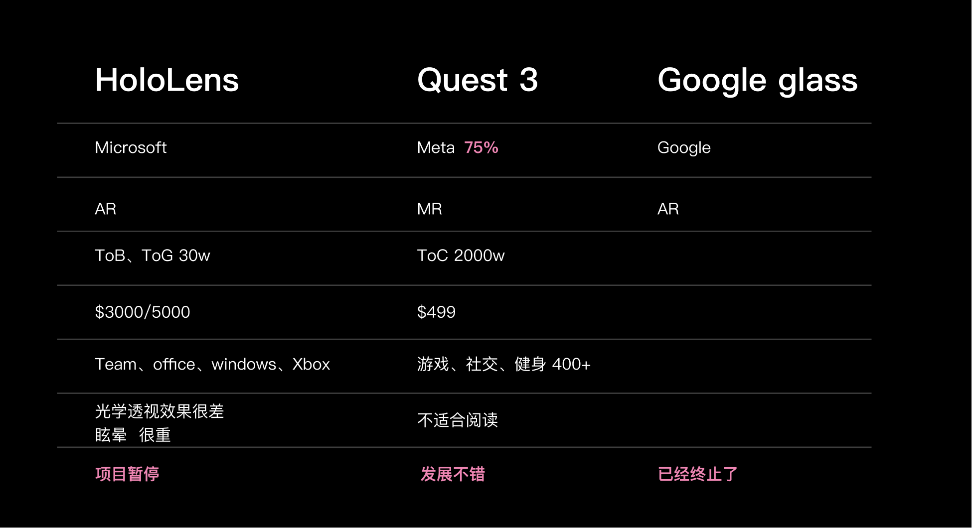 微软投入超过 10 亿美元的 HoloLens 项目在体验和应用方面都存在问题,目前该项目在公司内部的地位较为边缘。谷歌的 Google Glass 项目则因为各种问题直接停止了运作。Meta 的 Quest 虽然是目前发展最好的产品,但也存在不少问题。由于其采取的是低价换取市场份额的策略,导致硬件受到成本限制,无法提供更好的显示效果和运算速度。因此,大部分用户只将Quest作为娱乐或社交工具,而非生产工具。