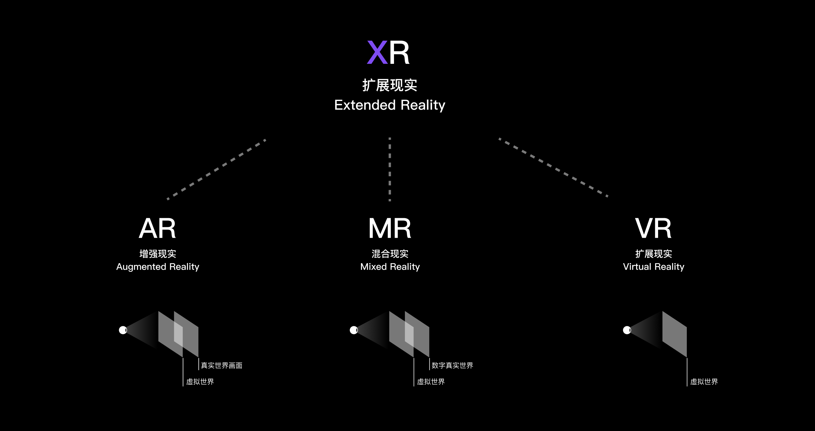 拓展现实(Extended Reality,简称XR)是一种涵盖了所有沉浸式技术的综合术语,主要包括增强现实(Augmented Reality,简称AR)、虚拟现实(Virtual Reality,简称VR)以及混合现实(Mixed Reality,简称MR)。