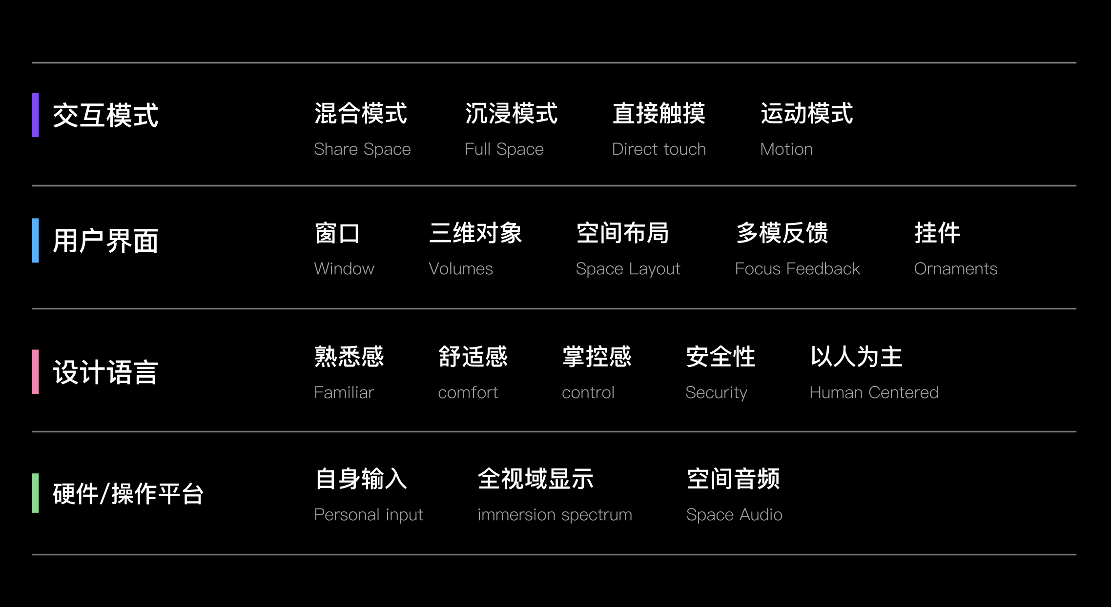 作为一名专注于互联网的体验设计师,我对VisionPro在此次展示中所呈现的技术和设计变革进行了深入的分析。我想明确的是,这些并非我认为是Apple的首创,而是我在VisionPro中首次看到的创新元素。我将这些变化划分为硬件&操作平台、设计语言、用户界面以及交互模式等几个关键维度,并将从这些维度中选取一些具有代表性的点进行详细解读。