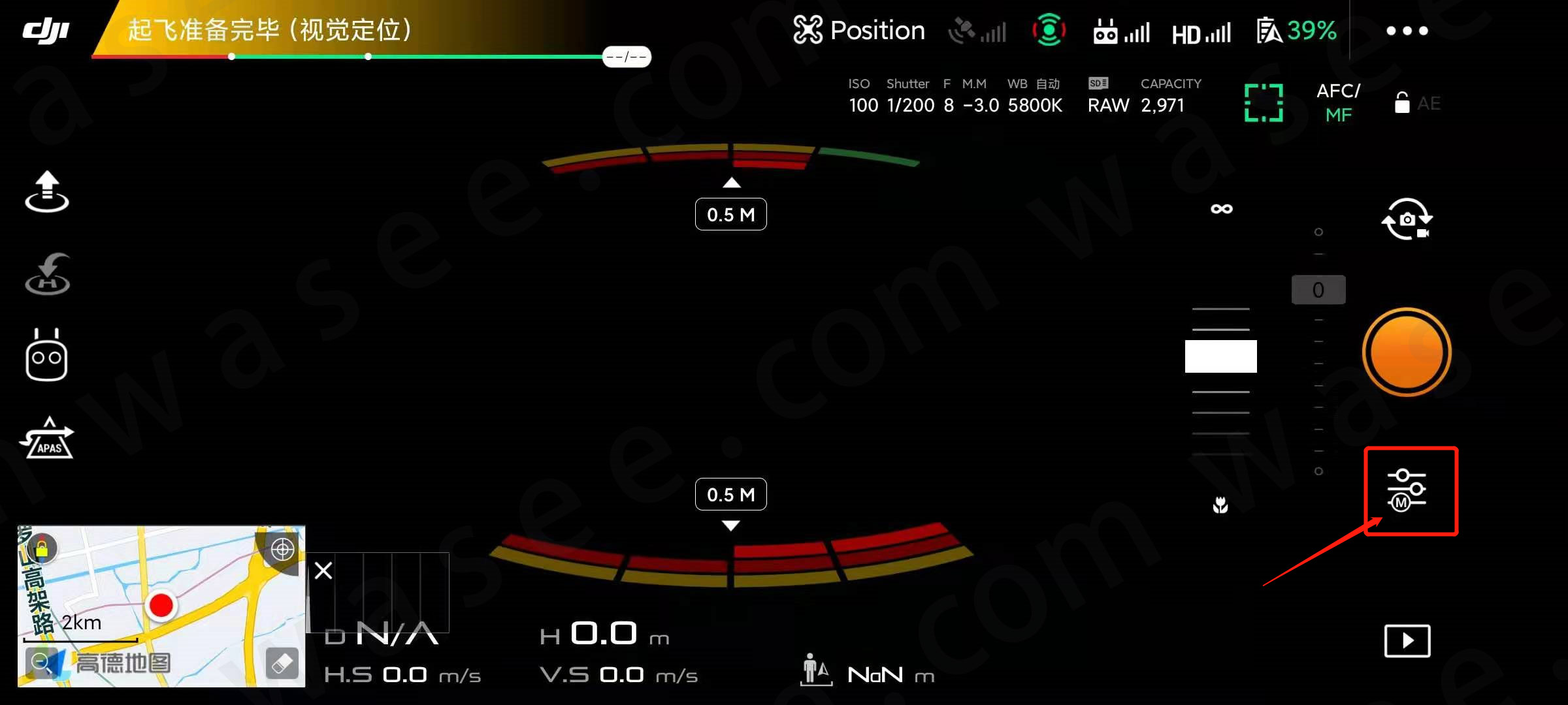 根据左下角的地图,在高空往回飞行,在肉眼可见飞行器后,将镜头垂直朝下。移动直至镜头垂直朝下能对准理想降落点后,降落(离地面1.5m后下降,飞行器会自动降落,云台会自动回正)