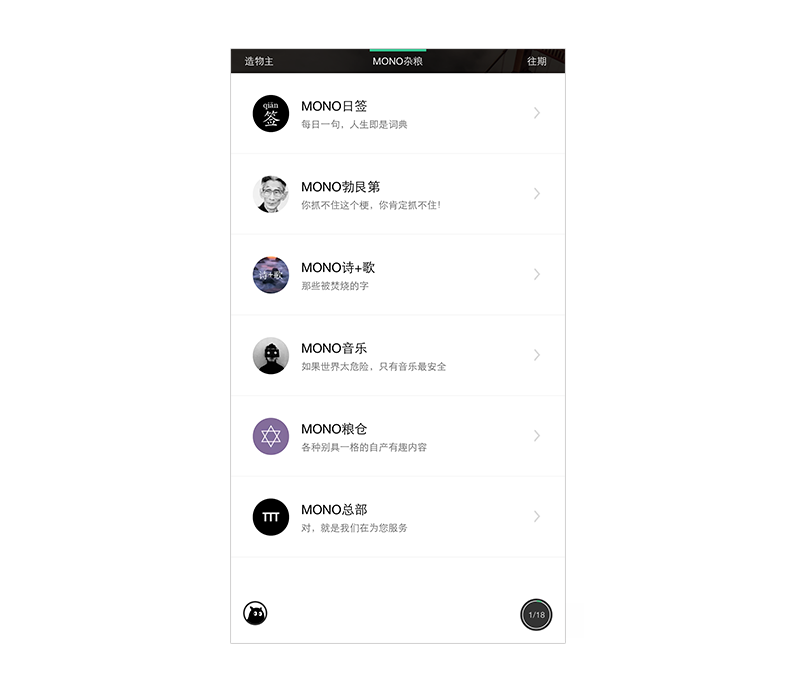 (1)滑动型:比如mono,他的导航栏采用左右滑动去选择功能模块,灵动,偶喜欢这种方式。