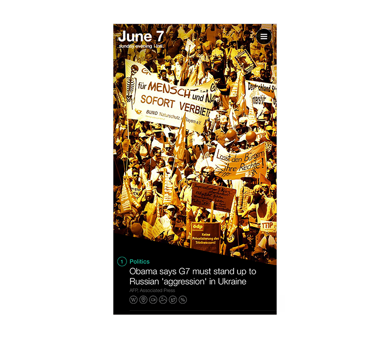 C、删除型:完全放弃导航栏和标题栏,因为功能选项设置在主界面,可以破坏死板的UI的固有形象。比如News digest