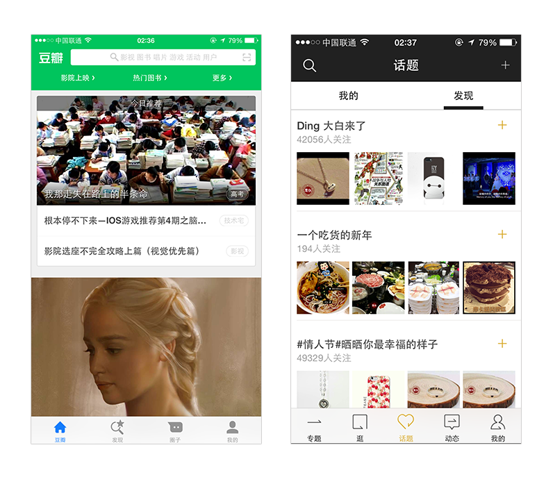 (1)普通下滑型,比如:豆瓣、QQ、微信、58同城、淘宝网、同程旅游……很多工具应用性强的APP都是走这个实用路线,他的功能模块在下方标题栏,就像一件不出错的衣服,看起来不够好看,但是实用。