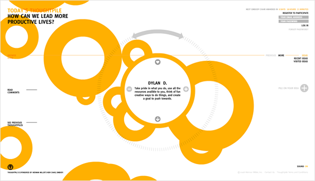 Thoughtpile.org site 有一个有趣的设计和运用图底关系的交互技巧。在这个网页中,这些关系似乎都在不断的变化着,似乎底元素转变成了交互性的图元素。效果很有趣,但是这种做法很夸张(频繁的变动是基于Flash网页的)。当正进行这种变化的时候,你就会更加清楚的知道你的观众和品牌。这个特别的例子似乎表现得非常好!