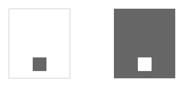 在上面的非常简单的例子中,有两张不同的图片,尽管这两张图片都有着各自鲜明的布局。左边的图片表现的是在白色背景上显示一块灰色的图片;右边的图片表现的则是带有一个白色色块的灰色图片(两者都是位于白色背景上表现出来的)。这两种关系都是由形成对照和人的经验的普遍惯例所确定的…当然,也依靠一些别的东西。
