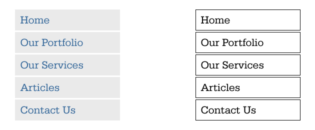 关于上面的例子,其中一个是成功的案例而且很容易去理解;而另外一个却是太过复杂很难有效的理解.这两个关于导航的组合(形式)其实从构成上讲都是挺独特的。但是左边的图片很快就会被认为是文字内容闲置在几乎无关紧要的背景阴影上(底)。然而右边的组合被认为是有两倍于(左边的)图片,因为其中的结构和内容都是由线条所构成的。在这种情况下,线条被当做内容来看待了,因此这个结构就会与内容相冲。最后的结果就是,(整个图片)很丑!而且没有吸引力!