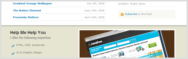 在“底”元素上存在有多种层次的层级。在上面的例子中,Chuck Mallott 在他的网页的主页上有效的联系了“底的深度”的层次关系,因此,层级的层次感也通过一个下阴影的使用得到体现。白色的区域是“在顶部”,而这个阴影区域是在更低的层次。阴影和更低层次的组合形成对比,使得阴影在整个页面层级上略微次要的重要性得到了很好的联系。