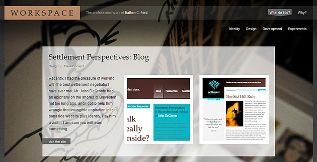 David Lam’ main page 似乎在某些方面是带有大量元素的复杂组合。但是通过对比和考虑到人们惯有的图底关系的理解。David有精心制作了一个设计,我们能够快速“模糊”背景然后看到一个非常干净的设计和开放式的布局。采用焦点聚焦的方法是在这里所使用的一个技巧。