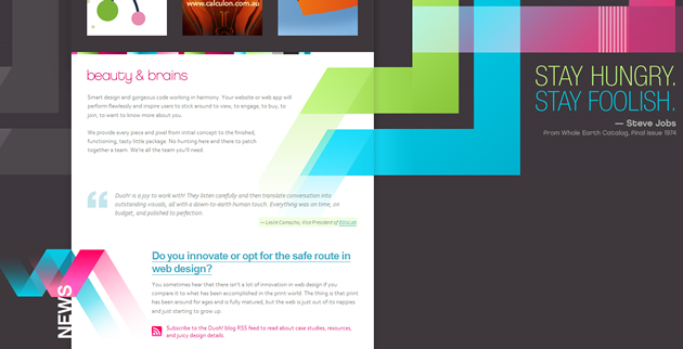 Veerle Pieters’ Duoh! Site做了一个图片和文本的精彩组合,似乎就像图和底交叉表现!而且,带有内容的光标的交互有时候会引起图和底的转换。整个的效果都是刺激和有趣的。这是一个似乎打破了规则(图底关系)的例子,但是,确切的讲,这仅仅是遵循了更深层次的图底关系原则,并且收到了好的效果。