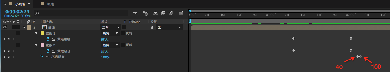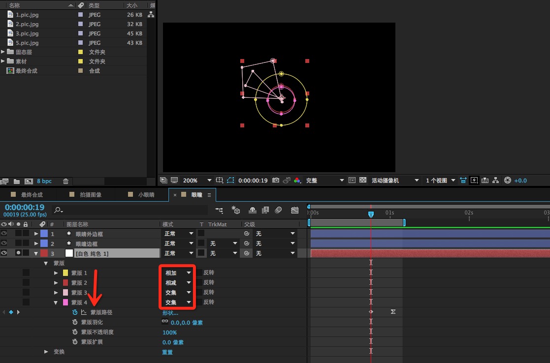 接下来是对蒙版4用关键帧,我这里是用蒙版路径来做的,其实也可以用蒙版扩展来做。还是上图