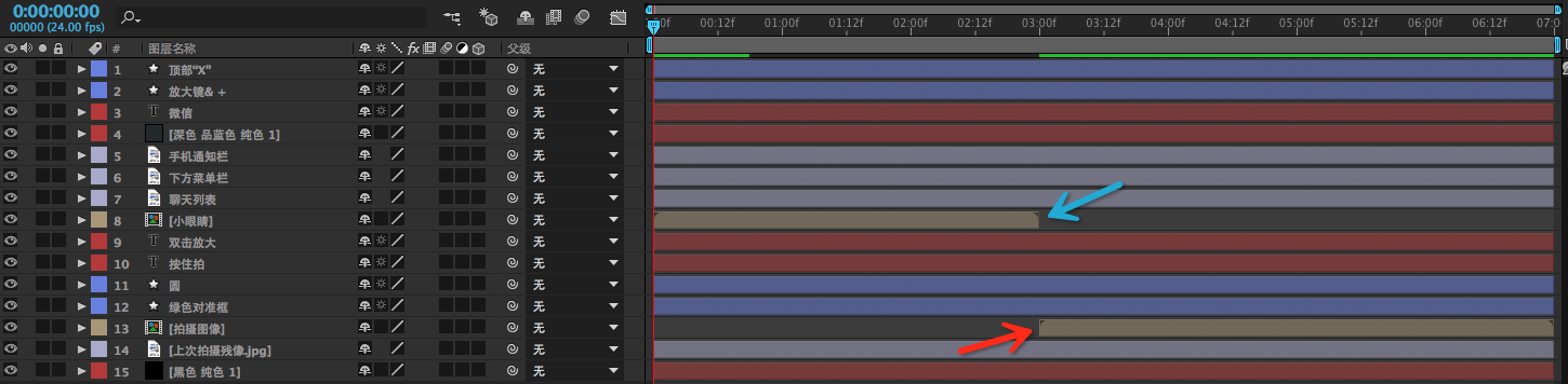 注意各种图层的叠放顺序和红箭头所指的地方,我把那个"拍摄图像"挪动了3秒;蓝箭头所指地方的意思是小眼睛的合成本来就只有3秒。