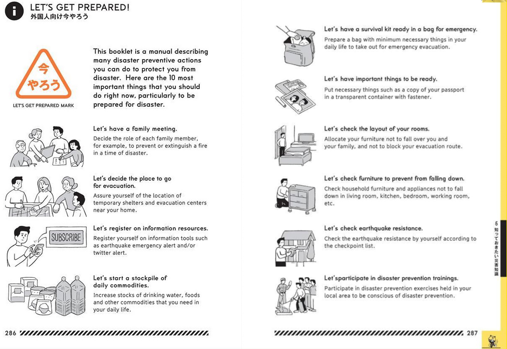 不像典型的官僚机构分发的材料和出版物那样,东京防灾手册设计的很精美。它是设计公司Nosigner、广告公司Dentsu与东京政府防灾部门协作努力的结果。该指南的鲜艳颜色使它脱颖而出,简单又易于识别的插图布局不仅便于理解而且更容易阅读。他们把指南直观的分为5章,涵盖地震模拟,灾前准备和生存技巧,手册的后序是Nosigner公司在2011年的地震和海啸发生后汇总并发布在Olive项目中的一些观点和建议。