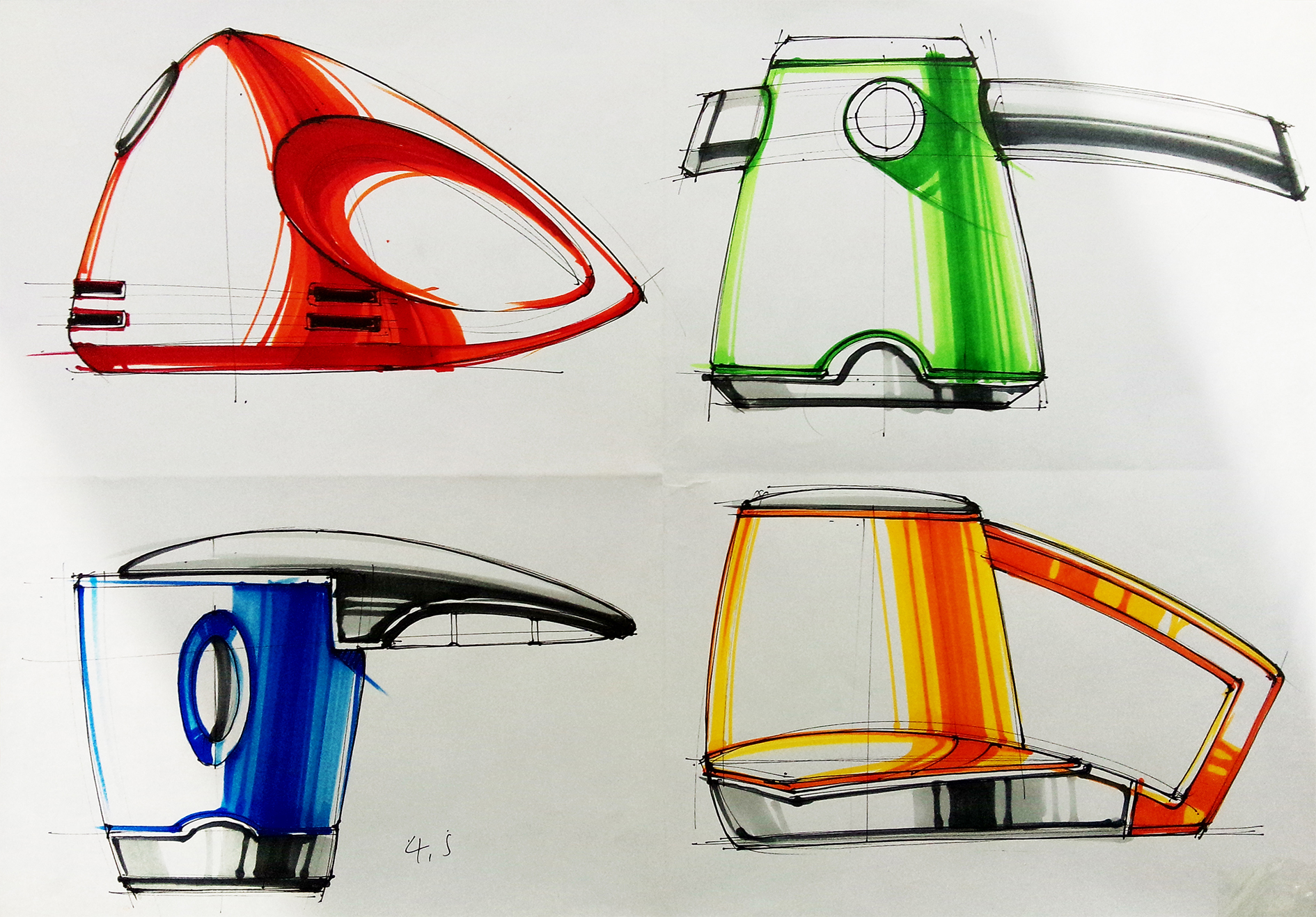 在工业设计手绘的学习过程中,虽然产品的三维效果图的刻画很重要,但是大家也千万不要忽略了另一个很重要的模块——产品三视图的刻画。产品的三视图在很大程度上可以很直观的将产品的轮廓造型、比例数据等传递给客户以及设计师。