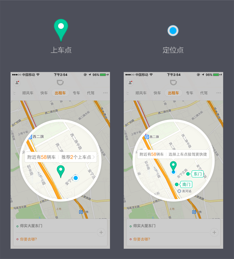 通常在地图中确认位置最重要的元素就是定位点的聚焦作用,而在滴滴的体验场景中我们发现,定位点(实时位置)与上车地点(约定位置)是不吻合的,打车时输入的上车点更多是一个区域,例如下班前在办公室叫单,定位显示在楼中间,等司机到达时,需要电话/IM等渠道与司机沟通具体约定在哪个位置上车(例办公楼下的某一条路),碰到对附近不熟路的司机,乘客亦不能很好的表达自己的方位,即使导航也无法输入确切目的地,这过程中必然会导致焦躁的体验。为此,我们设计了上车点,这只是循序渐进过程中的一个开始。