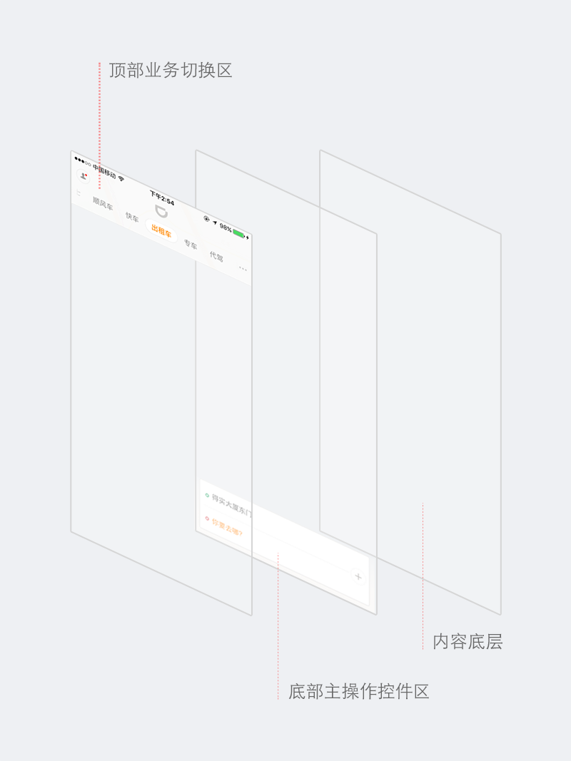 底部主操作控件区为卡片形式,将深度信息进行了简化,力求用小包装来承载大量信息,让内容更加直观,更具有视觉凝聚力。但是发单卡片有一定的局限性,由于空间问题,每一项一般只能讲一件事情,这种限制反而对我们有所帮助,迫使我们要做到所要表达的内容必须足够清晰明确,这样整个布局也就会显得更整洁。