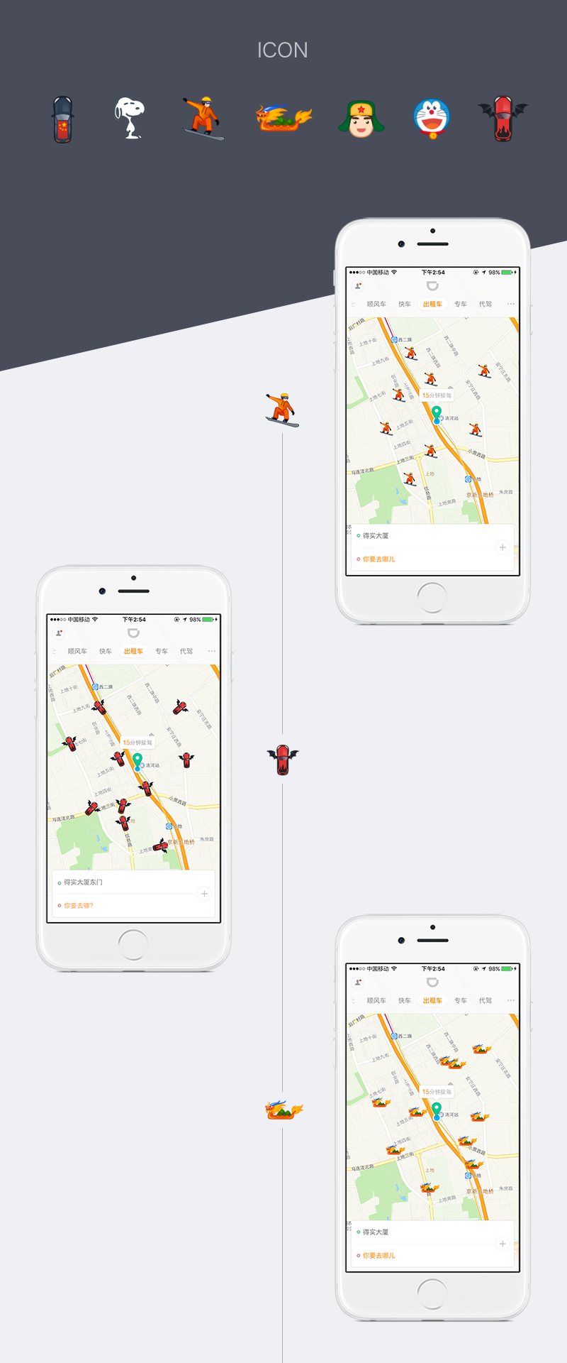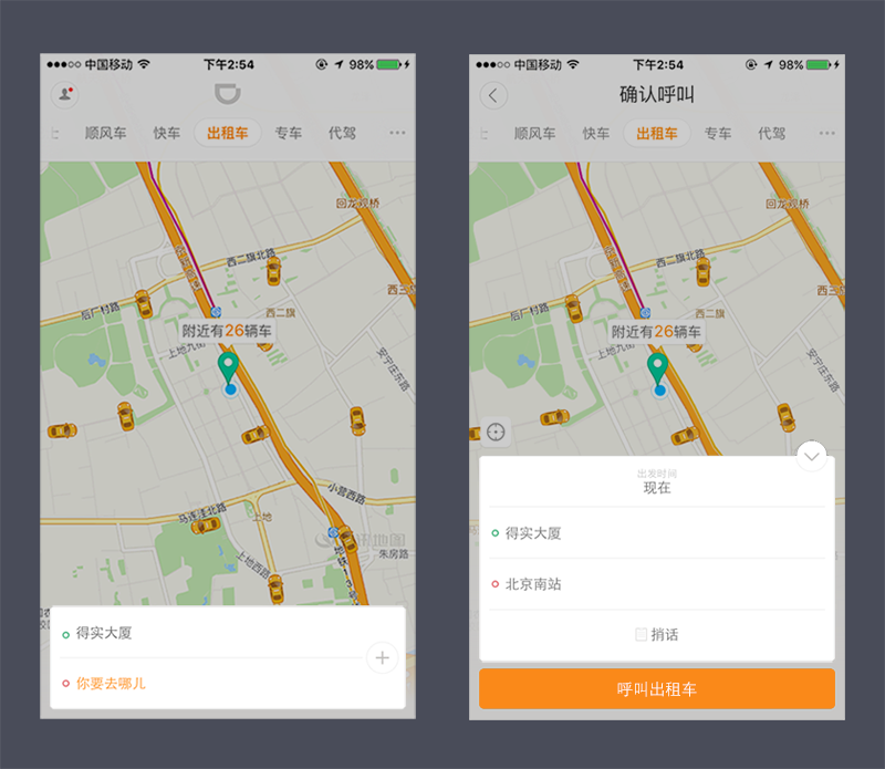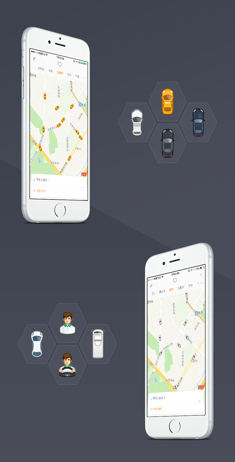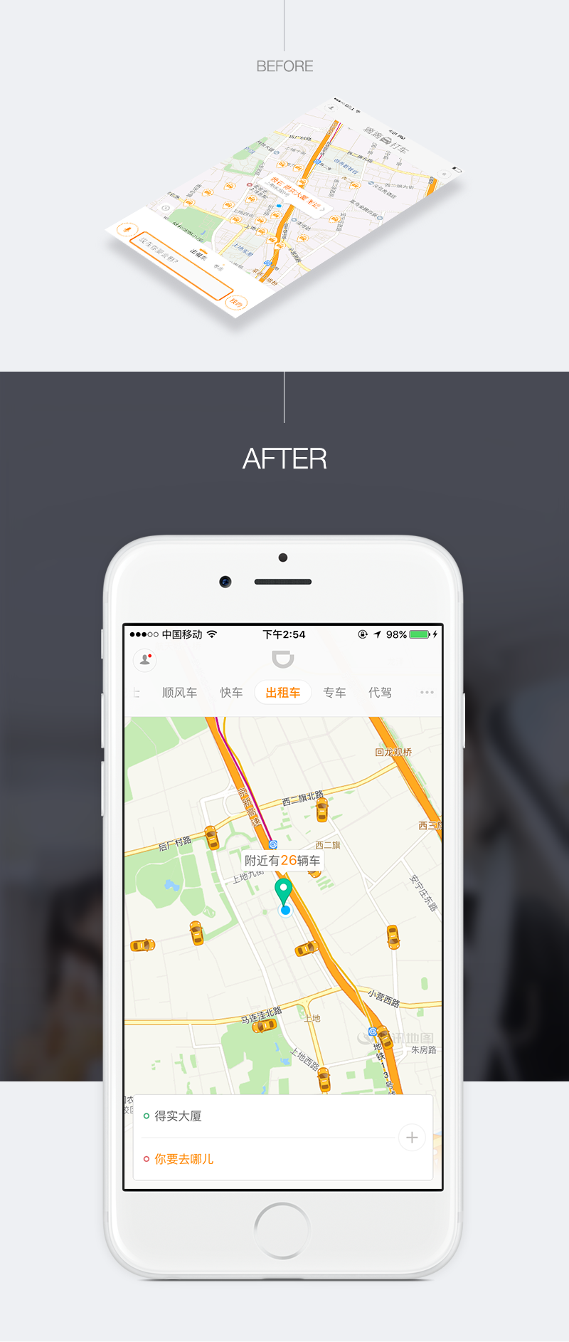 早期滴滴乘客端首页满满的水滴小气泡,有着微弱的业务区分(仅仅是抽象icon),等待接驾中不能清晰的识别司机行驶方向,且气泡的尖角富有指向性却没有指向内容,它是独立于地图之上存在的,像是贴在地图上的标签。