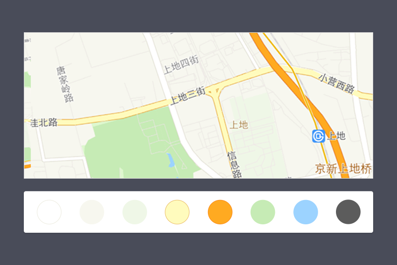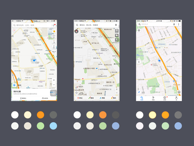 在单一比例尺下突出主要道路,从视觉角度出发,弱化下一层级的道路信息,减少密集度;将不必要的POI文字信息删减并缩小字号,考虑到滴滴使用过程中3D楼块对行程展示的干扰,将楼块平面化处理;整体色相进行重新调和,避免地图与上一层功能操作区产生粘连,不单纯使用灰色,加入一些色彩倾向,在设计上希望传达给用户一种简洁清爽的视觉感受,又能聚焦于内容。
