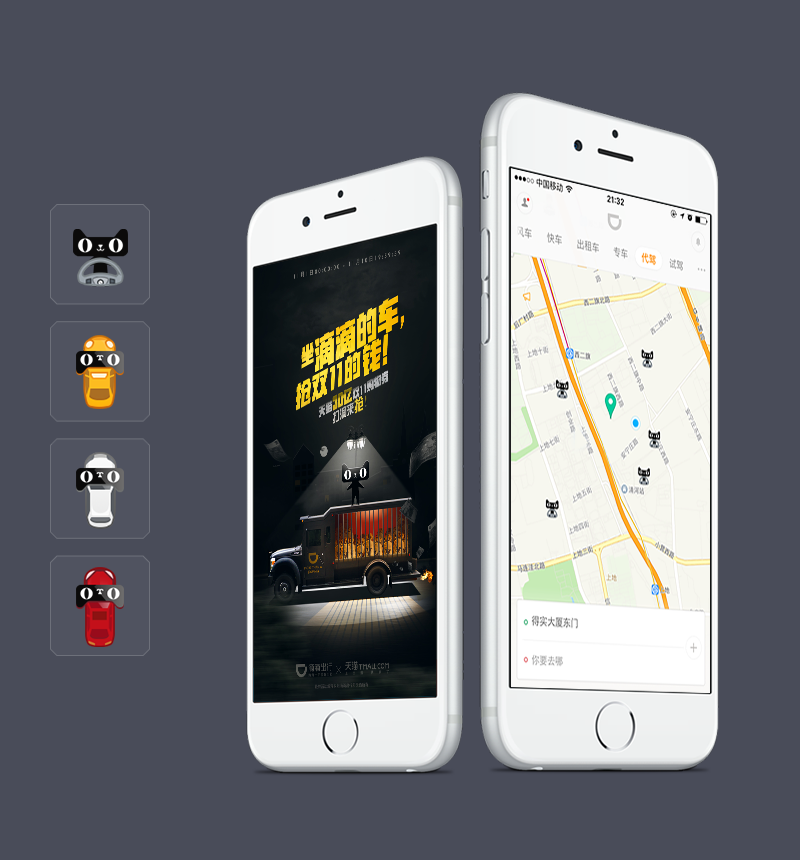 在吸附路面小车原有的形态中,我们为此寄托了丰富的情感空间,每逢有意义的节日、最新的社会新闻甚至特殊天气,都会结合时下元素对小车进行包装,而后华丽丽的跑在地图上传达出当时的氛围,感染到每一位滴滴用户。
