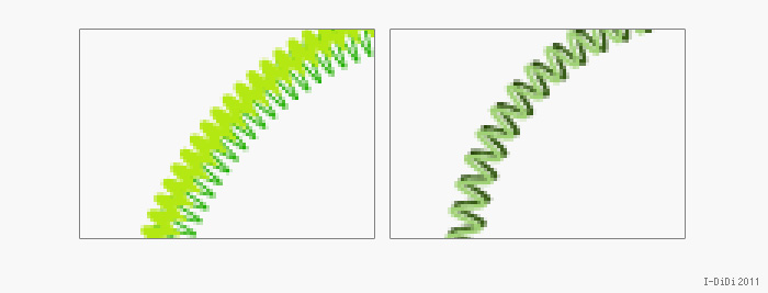 镶边的缝线,浅色的半径比深色的缝线半径要大,但是宽度更窄。置于最后的缝线有深色和浅色。深色置于最后,浅色在其上,并略微旋转2-3度,错开一定角度,就有了缝线的立体感:
