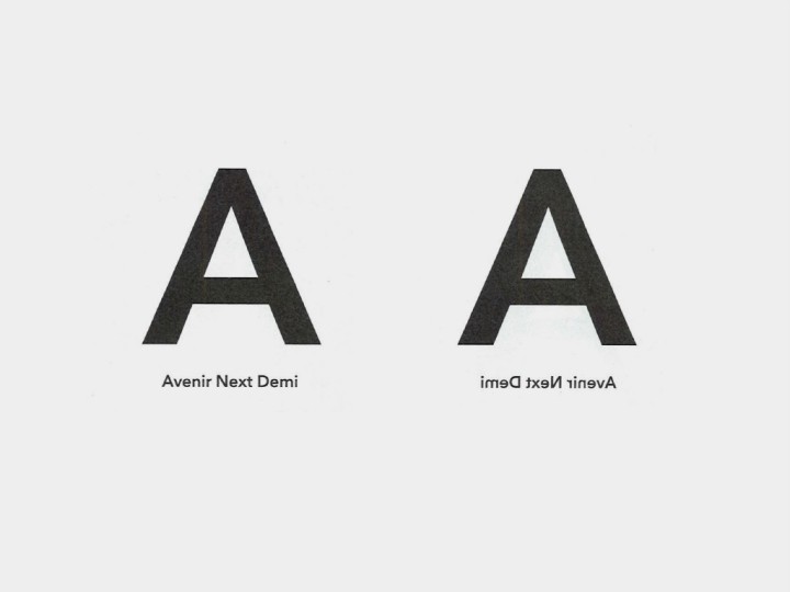 (5)虽然无衬线体的比划粗细基本一致,但实际还是有着细微的差距。从正面看到的A(左侧图)非常正常,然而当A被水平翻转后(右侧图),立刻就有了略怪异和不稳的感受。A的右侧比左侧笔划粗,是受到历史上平笔书写以及衬线体延续下来的习惯的影响。翻墙看视频《罗马体大写字母使怎么形成的?》