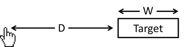 从一个起始位置移动到一个最终目标所需的时间由两个参数来决定,到目标的距离和目标的大小(下图中的 D与 W),用数学公式表达为时间 T = a + b log2(D/W+1)。