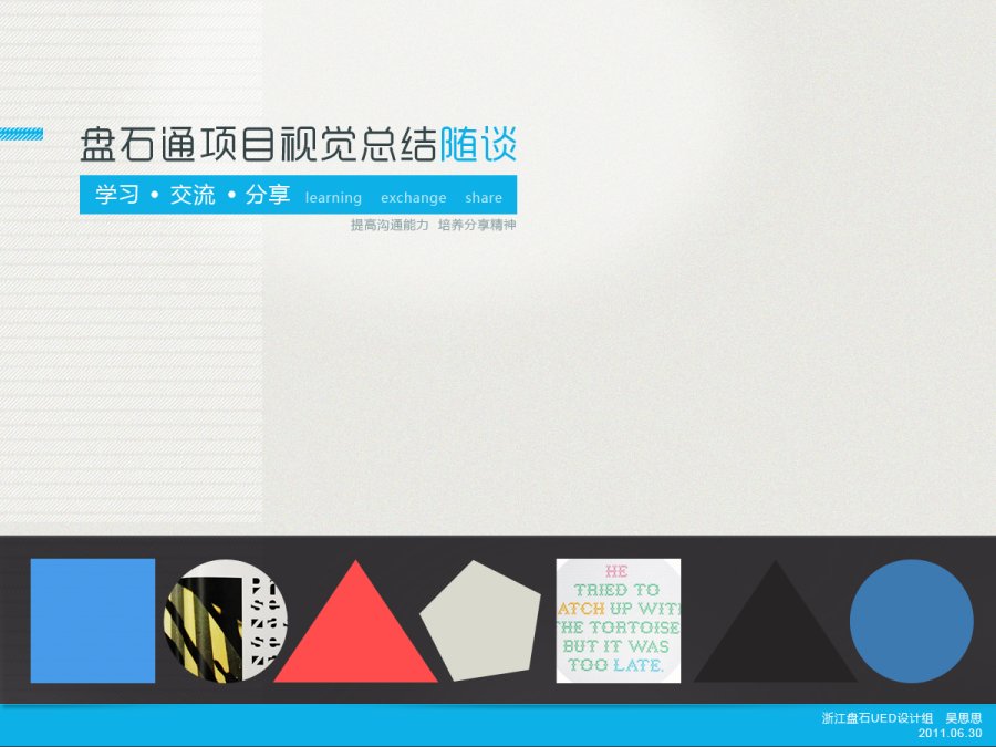 通过盘石通项目和组员一起交流当手头接到项目需求首要做的有哪些准备工作,如何去做?如何做好?包括大致设计思路、表现手法等,相互学习、交流、分享。做了一个PPT,整理了点上传,当做是一个个记录,嘿嘿