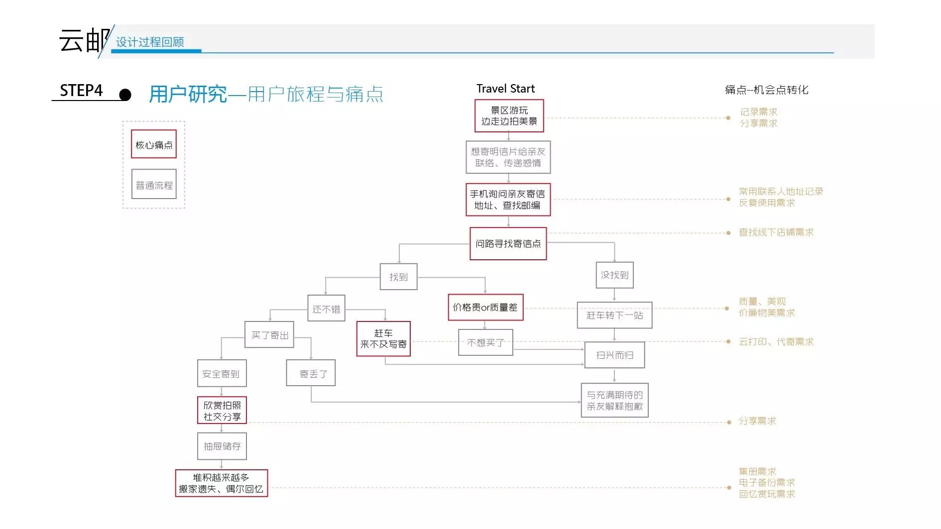这是《云邮》当时梳理的旅游人群在旅游场景下寄送明信片的一些痛点。还是拿小米手机来说。米1刚开始发布的时候,就切中了用户的核心痛点:高配置、低价格。同样的配置,三星要4000,小米只要1999。这是核心痛点,再比如:刷机流程;支持双系统等。也是用户痛点,痛点可以让用户选择你的产品,而不是别人的产品。这是第一个重要的部分。比赛和创业一样,一定要选对方向。