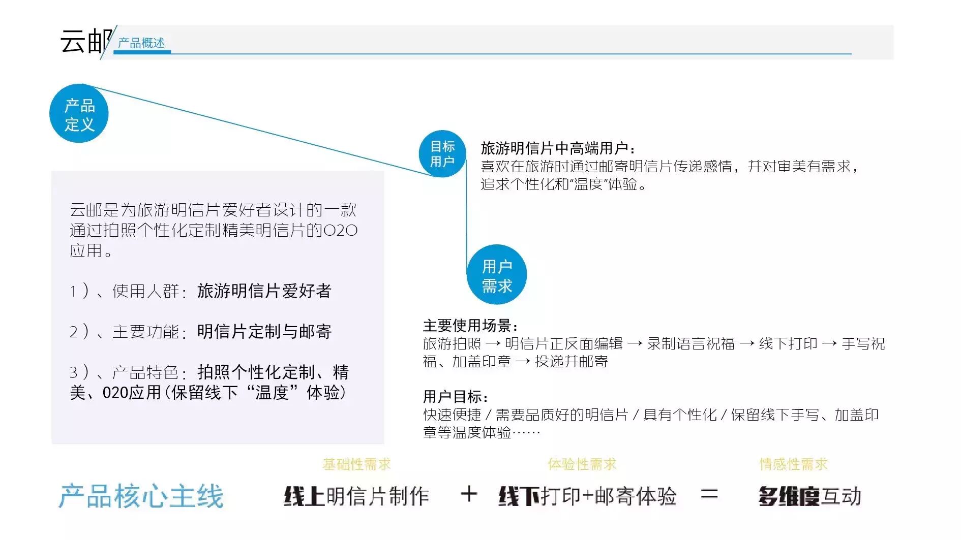 1.“一句话”理论。一个好的产品绝对是可以用一到两句话概况的,如果你一到两句话讲不清你的产品,说明你的产品设计是失败的,这个“一句话”,对用户和对自己设计团队(或者评委)是不同的。举个例子:充电五分钟,通话两小时。这是对用户而言的。云邮是为旅游明信片爱好者设计的一款通过拍照个性化定制精美明信片的O2O应用。这是比赛时对评委,创业时对投资人或者同行介绍时的一句话。这句话怎么概况,http://tangjinweb.com/?page_id=483这个里面有。