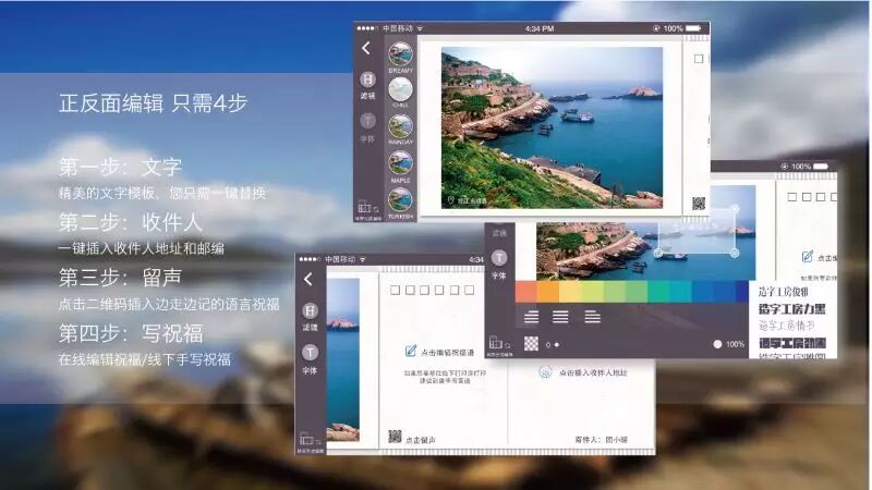 云邮是为旅游明信片爱好者设计的一款通过拍照个性化定制精美明信片的O2O应用。
