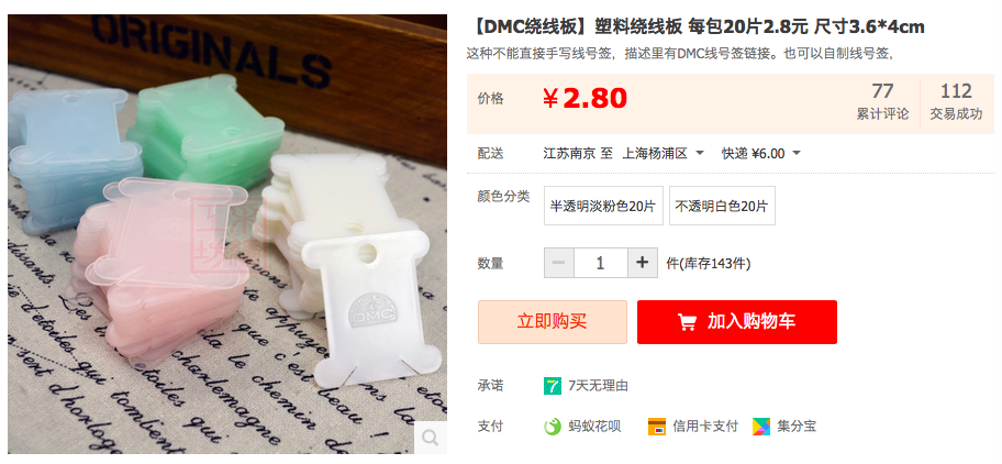 买DMC绣线的时候,在同一卖家那里买了DMC的绕线板,2.8元/20片,质量不错,卖家还送了几片普通的塑料绕线板,质量的确差很多,所以如果要买塑料绕线板的话就买DMC的好了,普通的价格没有差多少,品质却差了很多