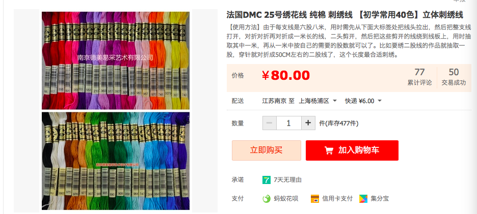 DMC25号线,考虑到新手一开始也没必要很多颜色,于是买了店主推荐的初学常用40色,2元/支,6股x8米