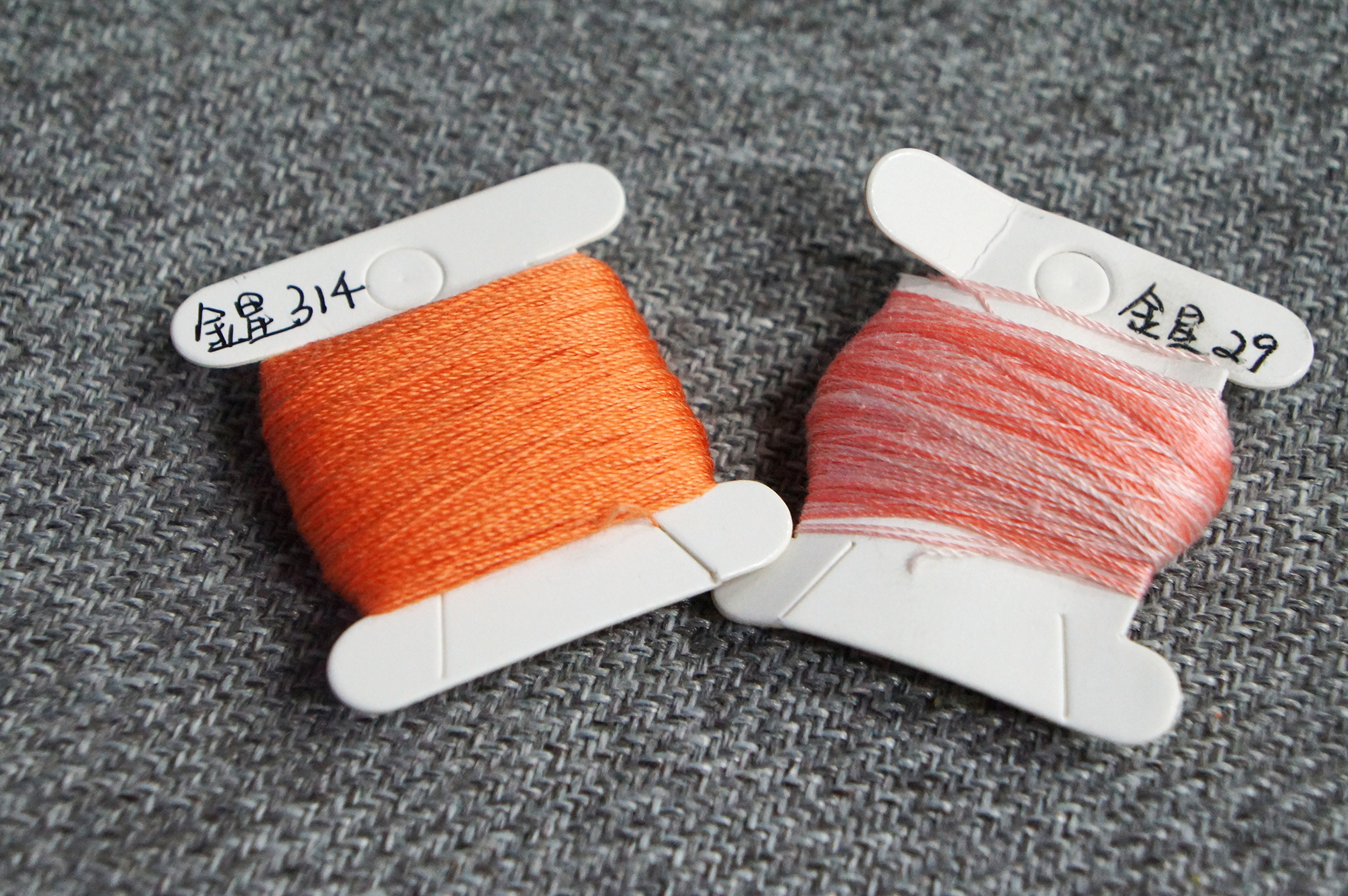 金星和DMC的绣线在品质上还是有差别的,两个线放在一起比较就可以很明显地看到,DMC的光泽度比金星的要好很多,单股也是平整均匀纹路清晰,金星的则会有些不太均匀。不过整体来说金星的绣线对于我们这种初学者来说,已经完全足够使用了。等以后技术熟练,打算绣正式作品的时候再用DMC也无妨。