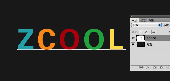 1、先填充一个背景,颜色为#333333,打上字母,然后填充颜色,填充分别是淡蓝(偏青)#00aeb7,橘黄#ff9900,暗红#ba0000,草绿#01ad4e,淡黄#fede58。