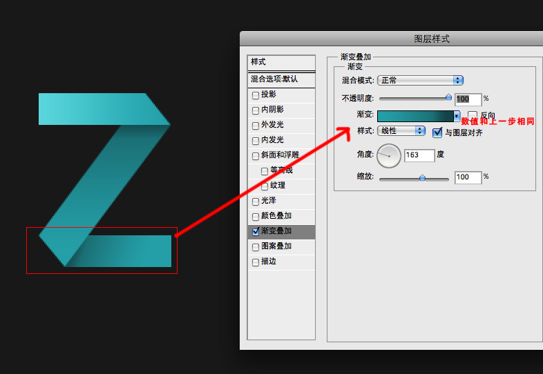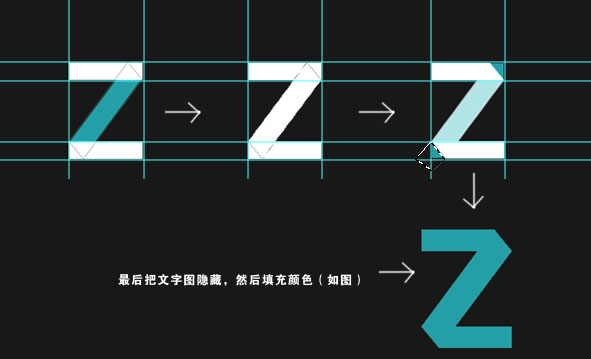 3、我们先从z字开始,首先我们要把Z字的横的高度和竖宽度设置成一样然后把一样的。然后新建个图层,新建个矩形,然后放到Z字上去。然后一次把宽和高调好。然后将在制作竖的时候可以把矩形的透明度调低点。