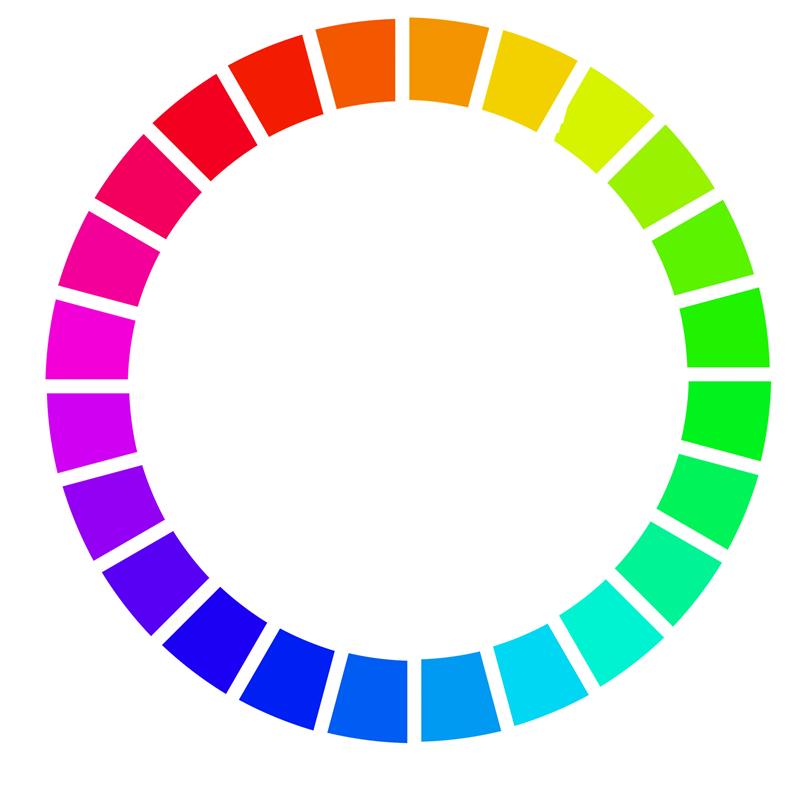 上次说了,色相环(也叫色环),其实很简单,就是把彩虹带上的颜色加上紫红色,再把直的颜色带圆成一个圈,OK了!