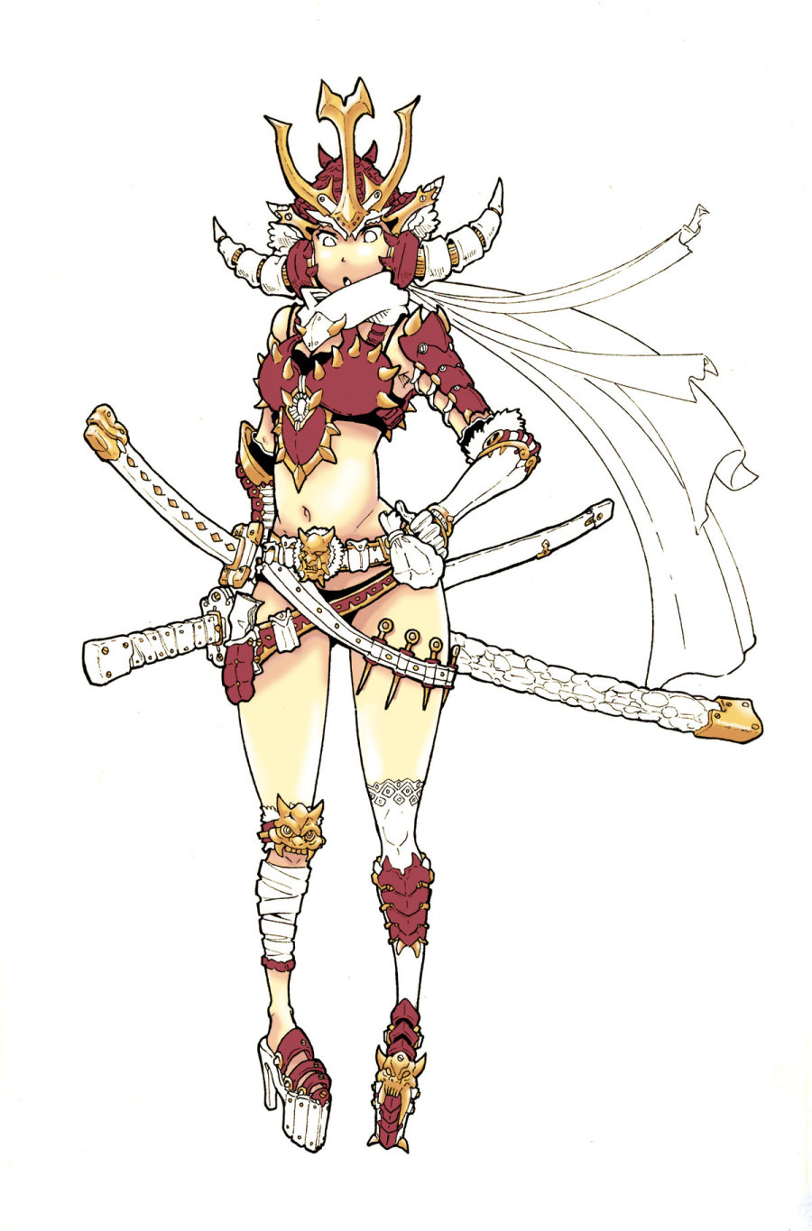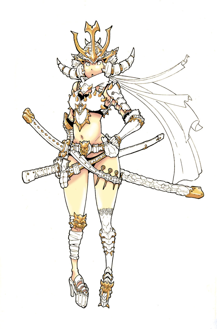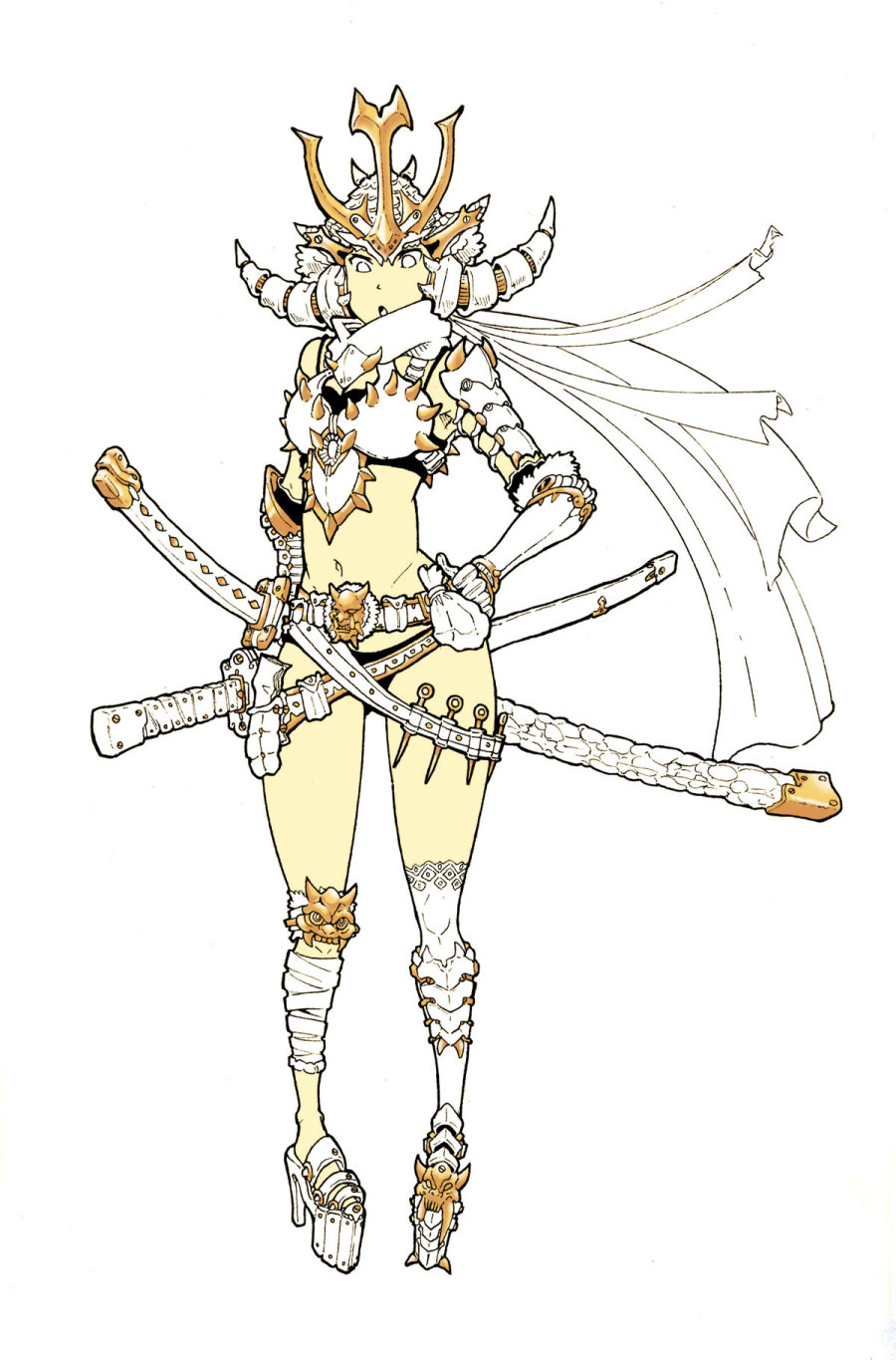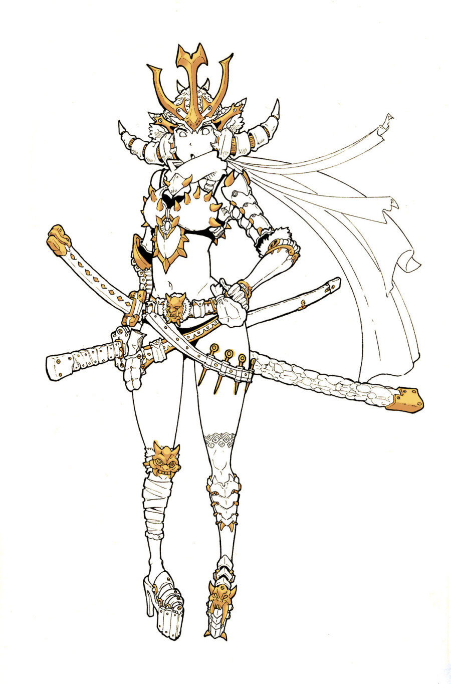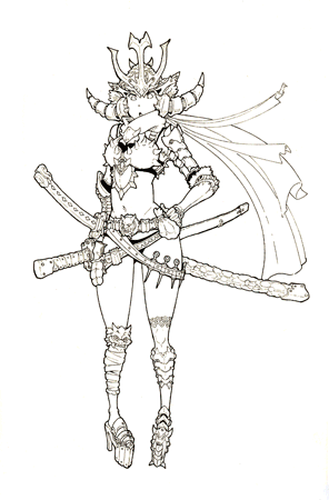 先讲讲这次上色的契机,前两天在站酷首页看到白用感叹号大神的丙烯上色,感慨颇深。自己便也画了个女武士上一下色,由于不习惯数位板,所以我的画一般是手绘,扫描后再在PS上用鼠标上色,这次上色只用到一个笔刷,就是PS里最基本的圆头笔刷,好下面开始过程~~
