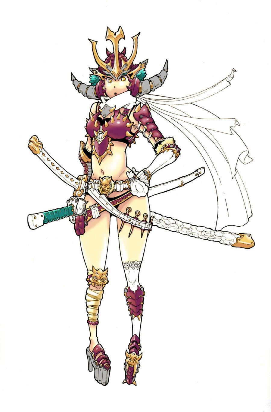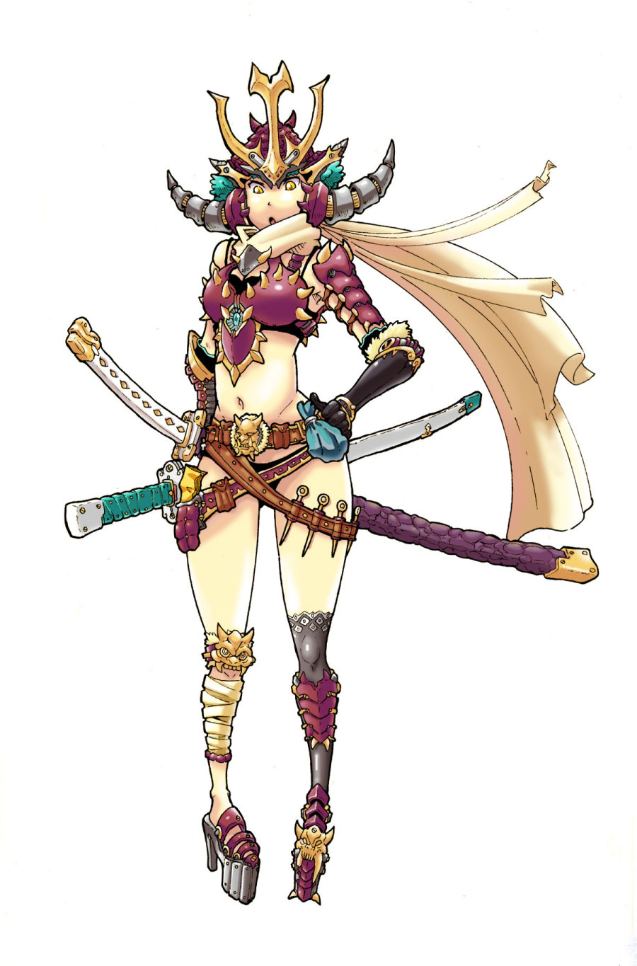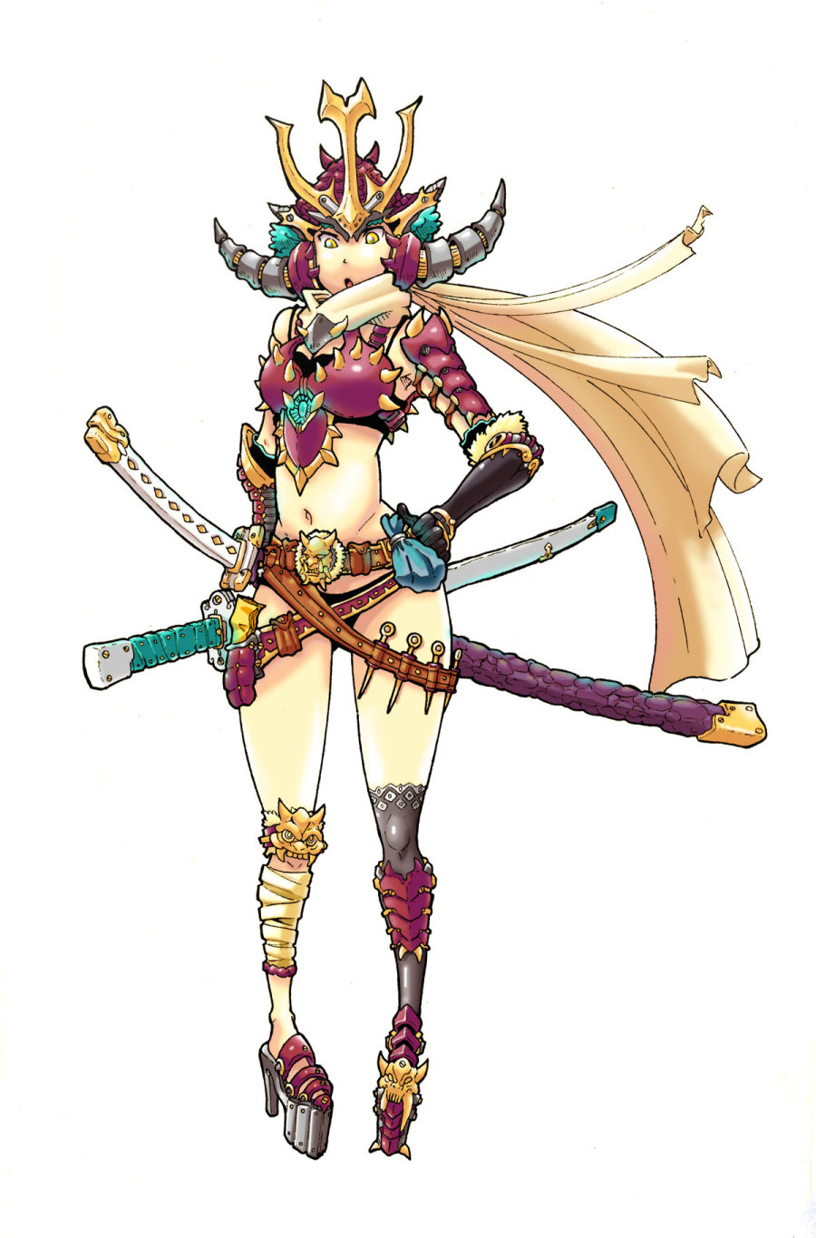基本色调完成后,可以选择小面积加上亮色丰富画面,这里我用了青色在太刀的把手和女武士的头发上。